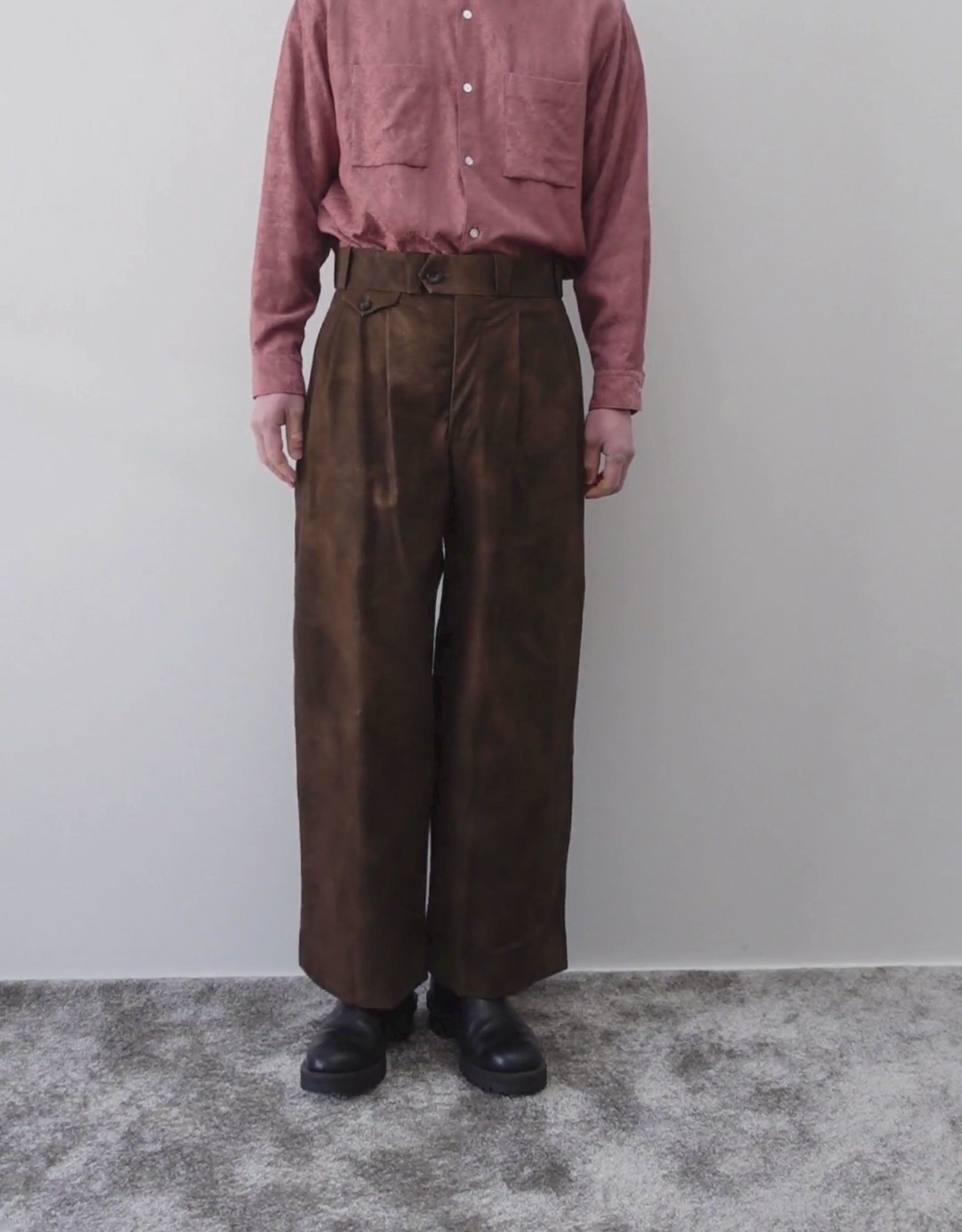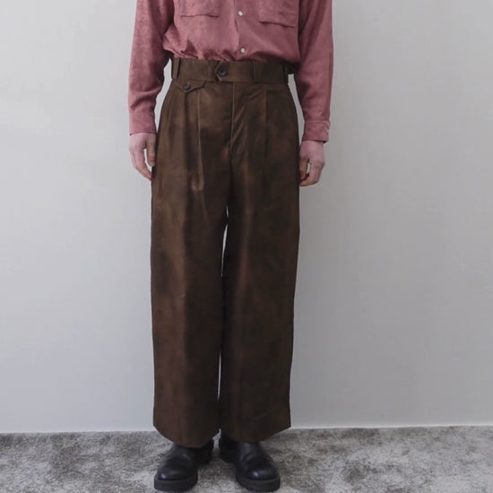 型はダンスウェアの意匠的デザインにインスパイアされて構築したブランドの代名詞パンツ。バックポケットにもタックを入れ、360度美しい円柱を描く立体的な極太シルエット。