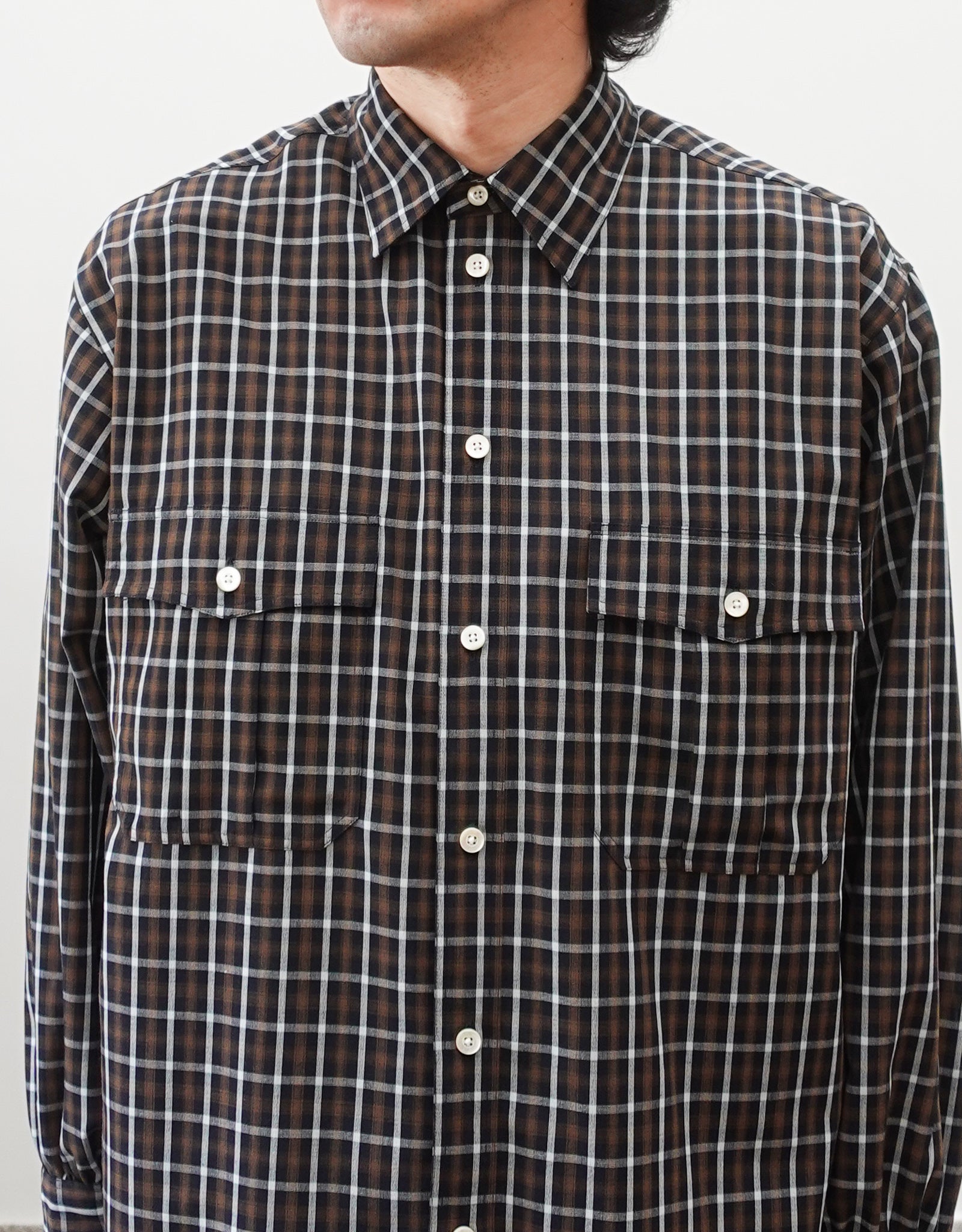 縦糸緯糸ともにヴィスコース糸にポリエステル糸をカバーリングした強撚糸で上品でクリーンなマルチチェック柄に織り上げたドライタッチでシャリ感とハリのある生地のトロピカルシャツ。